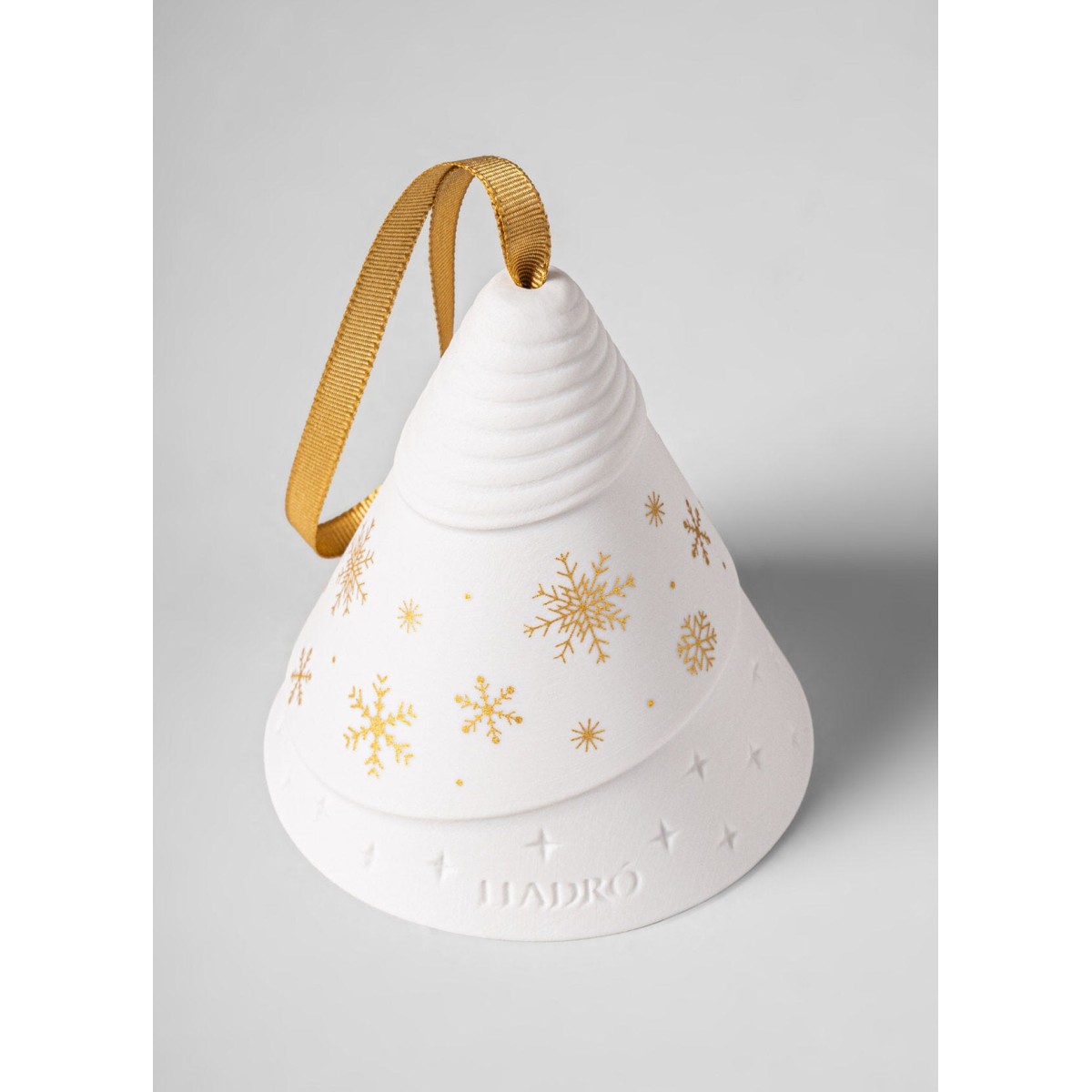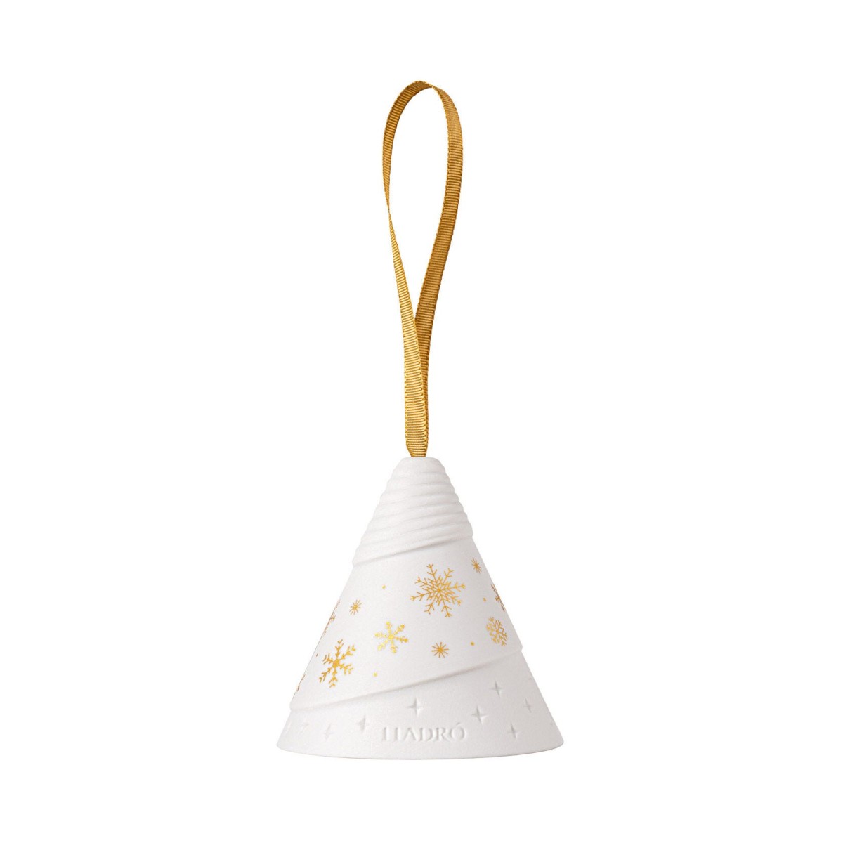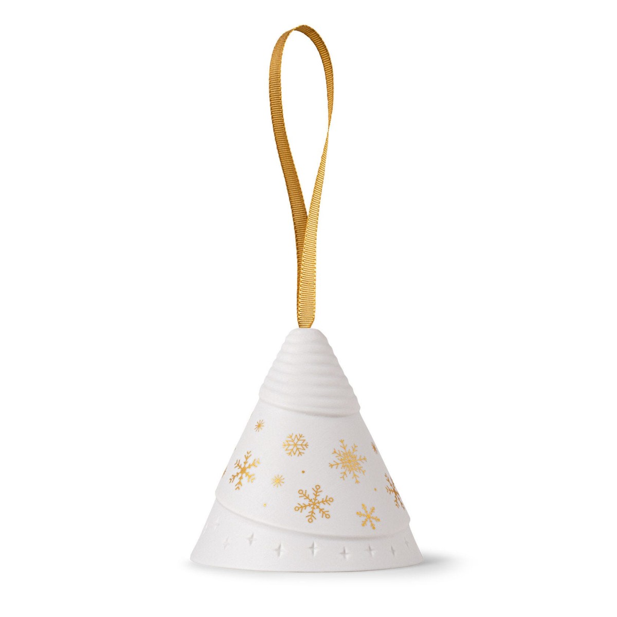 Эта елочная игрушка из матового белого фарфора имеет конусообразный дизайн, украшена вручную золотыми снежинками и выгравированными звездами, и тонким рельефным рисунком. Изделие передает очарование зимних пейзажей и теплое сияние праздничных огней.