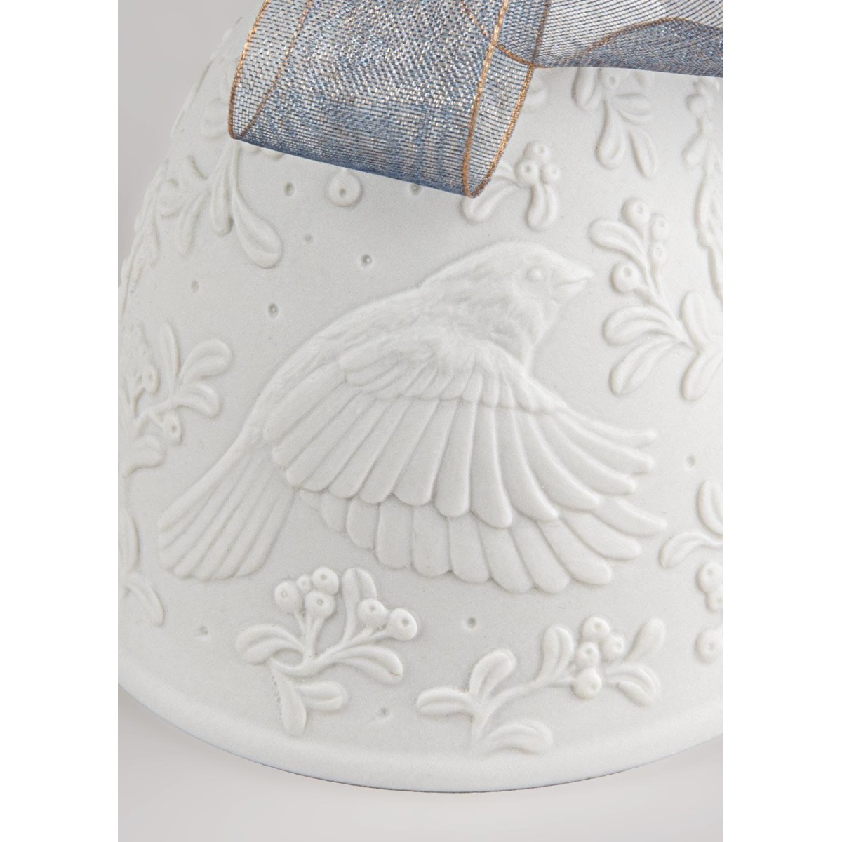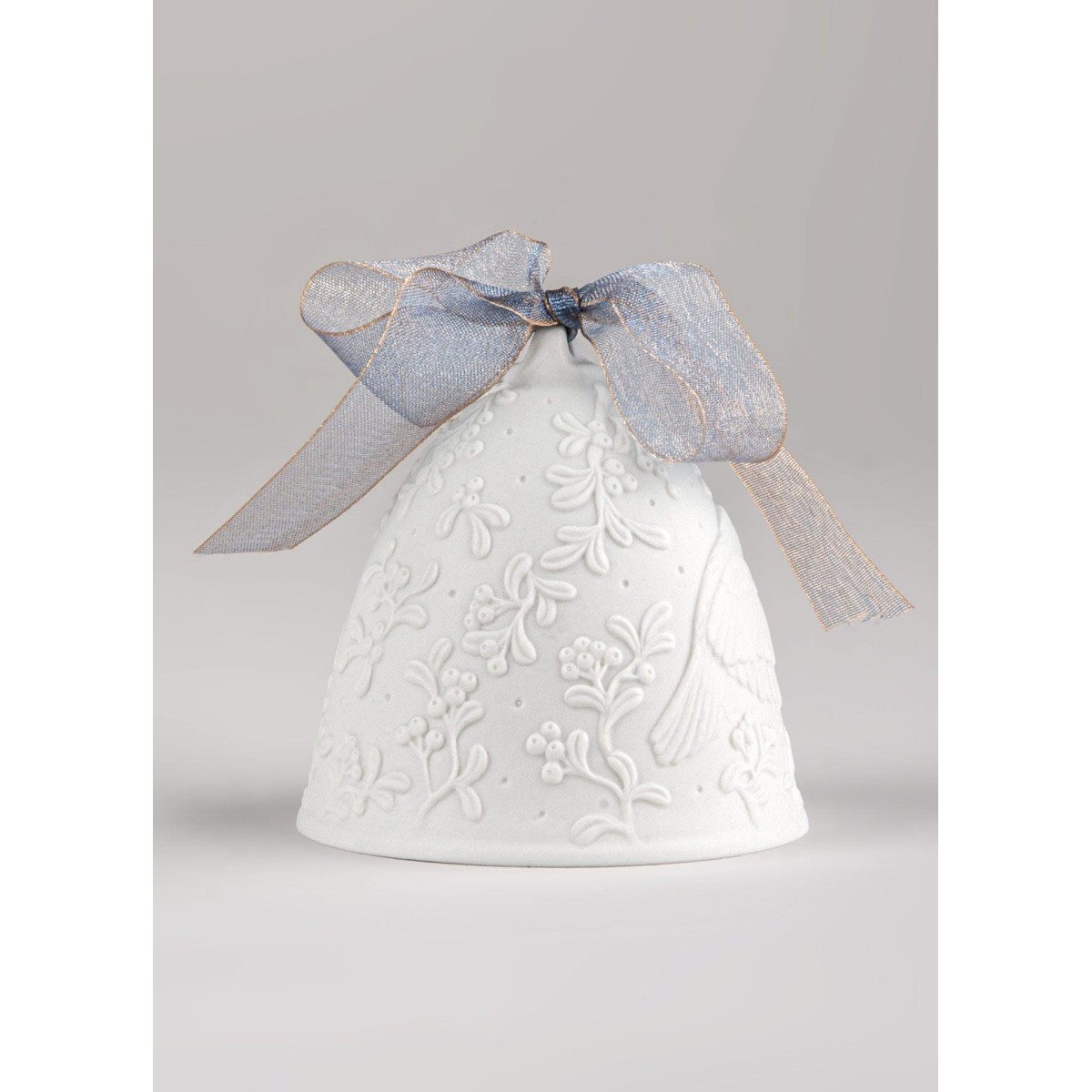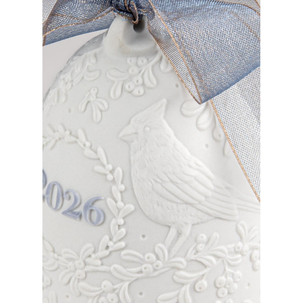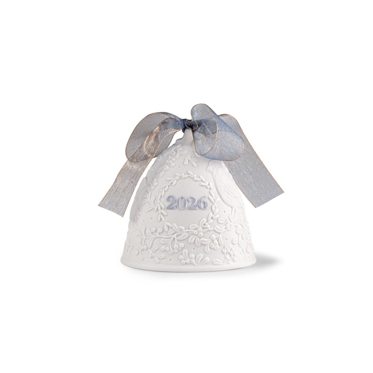 Рождественский колокольчик 2026 года станет украшением самого душевного времени года, когда коробки с елочными украшениями открываются, снова звучат знакомые мелодии и дом наполняется ароматом корицы и мандаринов. Это фарфоровое изделие украшено изящным рельефом в виде ветки падуба - традиционного рождественского символа. Дизайн дополнен надписью 2026 года, выделенной мягкими пастельными тонами. В комплекте идет голубая лента с золотым кантом.