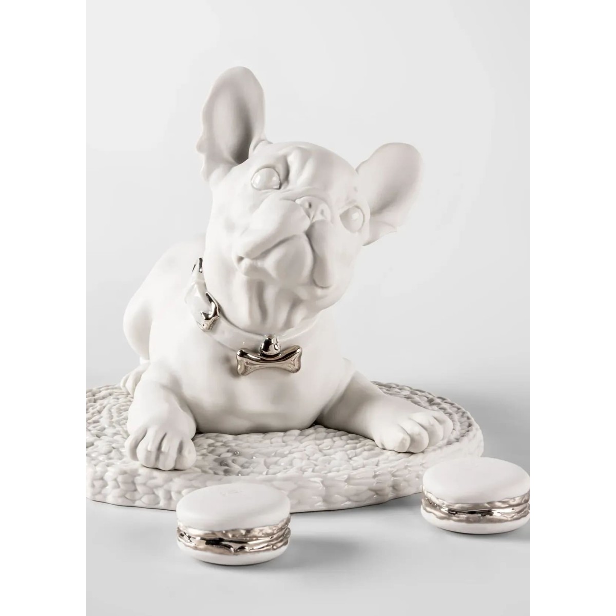 Фарфоровая скульптура очаровательного французского бульдога, застигнутого за игрой. Скульптура выполнено в белом матовом фарфоре с элементами серебряного люстра. Макаронс и коврик входят в комплект, как отдельные элементы, которые можно расставлять по своему усмотрению. Эта работа является частью коллекции Re-Deco.