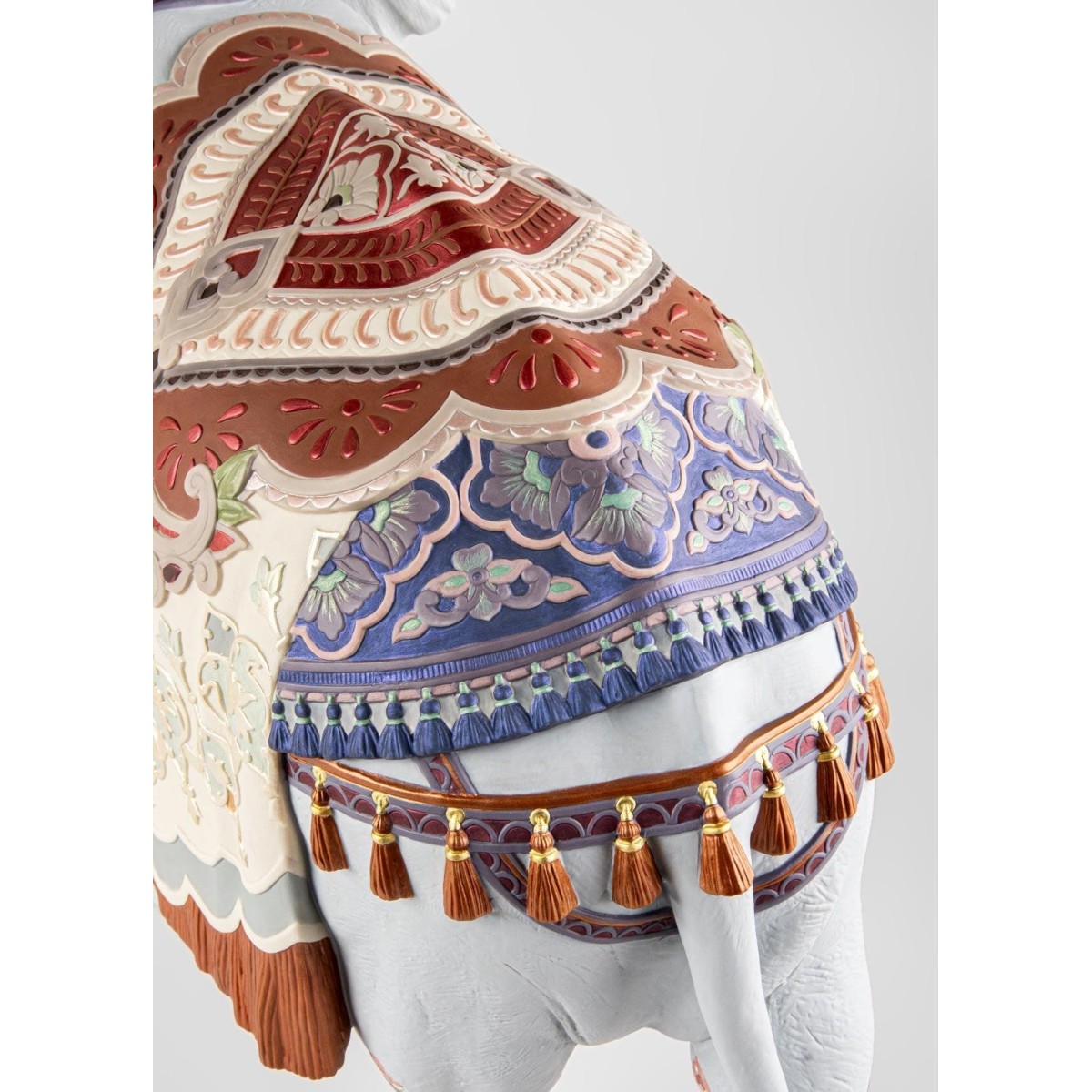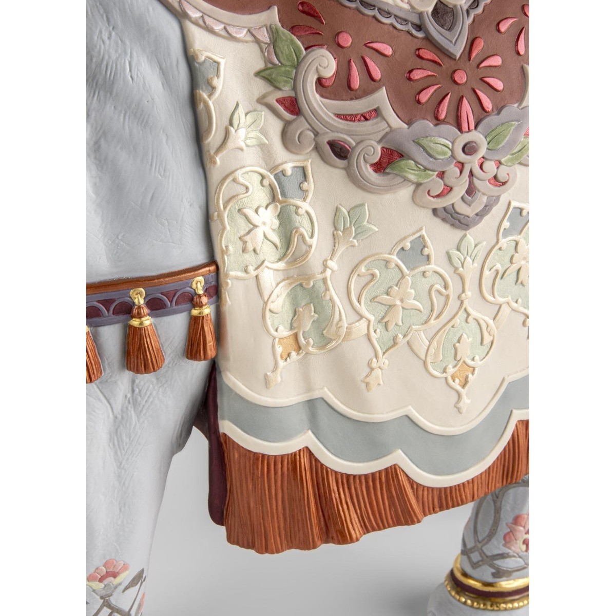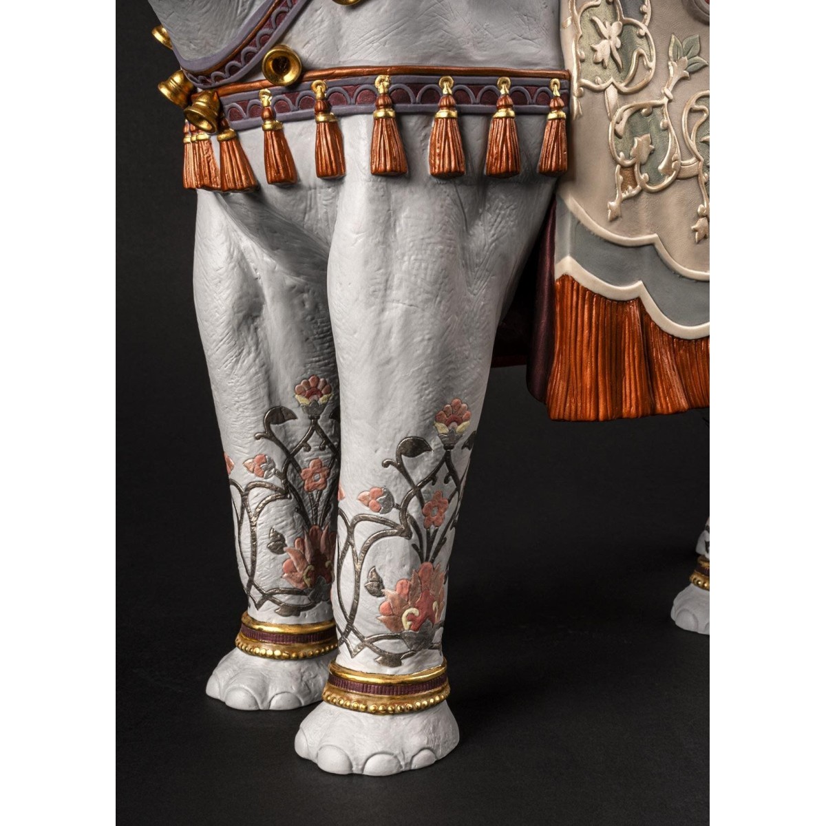 Особого внимания заслуживает цветовая гамма: 20 уникальных различных оттенков эмали были использованы для покрытия этого изделия. Оттенки оранжевого, кобальтово-синего, изумрудно-зеленого, лавандового и розового сочетаются с золотым люстром, добавляя визуальной насыщенности. Изюминкой являются фарфоровые кисточки оранжевого цвета и гирлянды с золотыми колокольчиками, свисающие с шеи и боков слона, напоминающие о праздничных и церемониальных шествиях. Изящные цветочные гравюры на ножках слона продолжают язык орнамента.