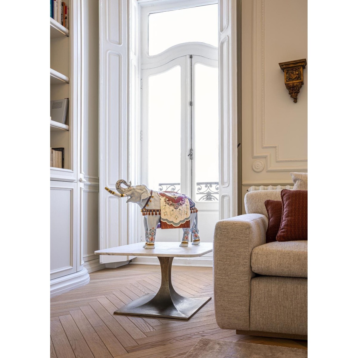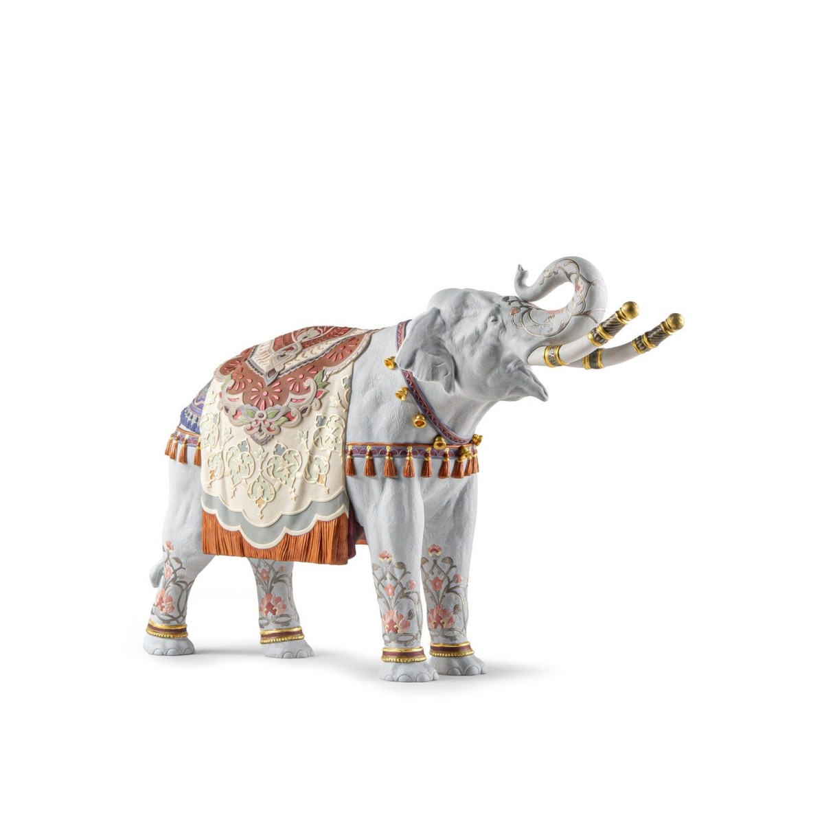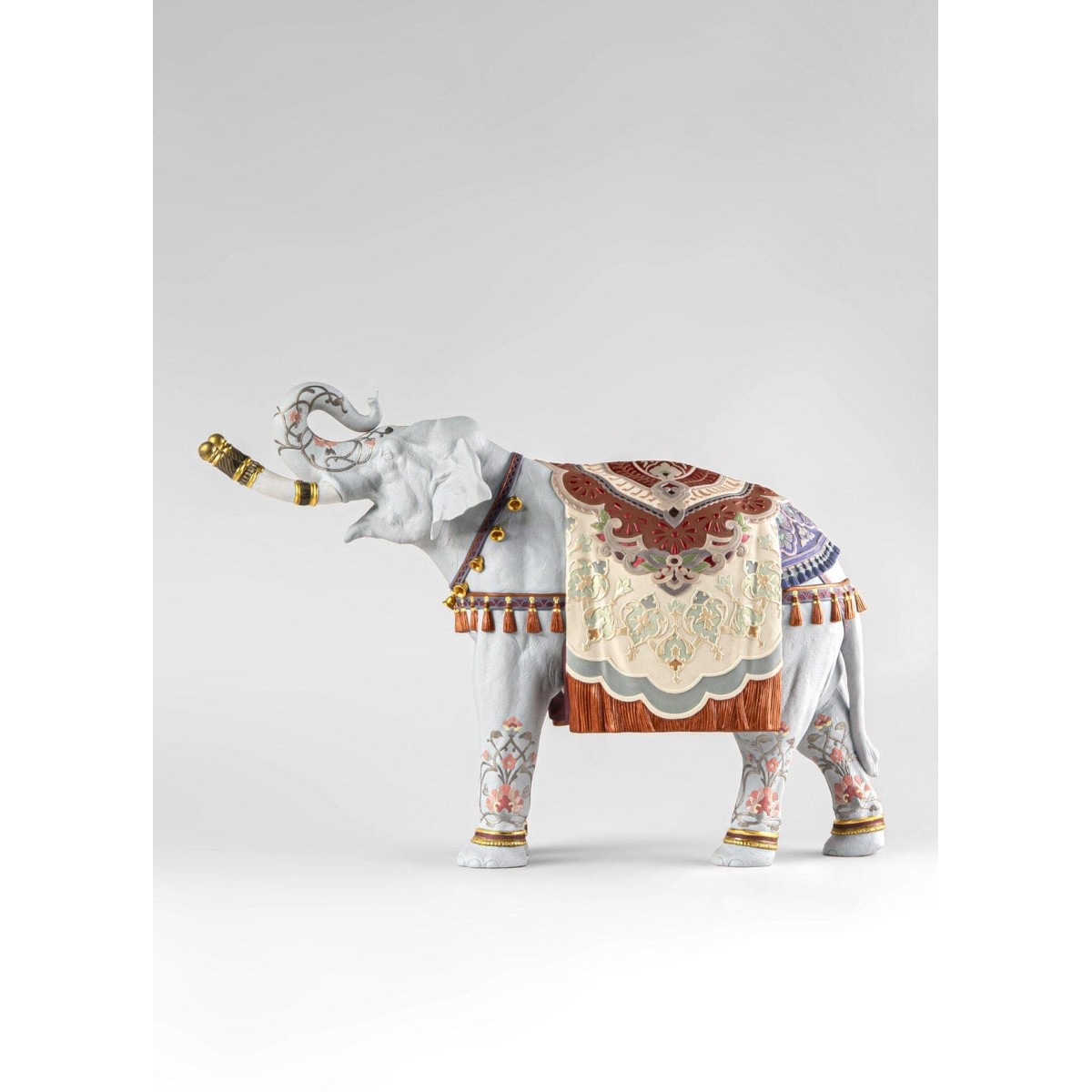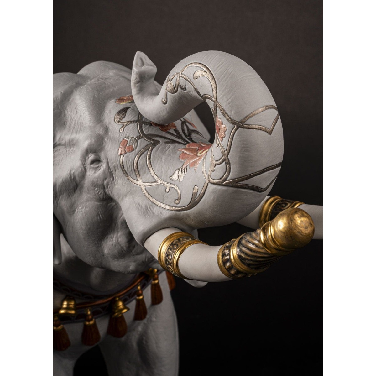Особого внимания заслуживает цветовая гамма: 20 уникальных различных оттенков эмали были использованы для покрытия этого изделия. Оттенки оранжевого, кобальтово-синего, изумрудно-зеленого, лавандового и розового сочетаются с золотым люстром, добавляя визуальной насыщенности. Изюминкой являются фарфоровые кисточки оранжевого цвета и гирлянды с золотыми колокольчиками, свисающие с шеи и боков слона, напоминающие о праздничных и церемониальных шествиях. Изящные цветочные гравюры на ножках слона продолжают язык орнамента.