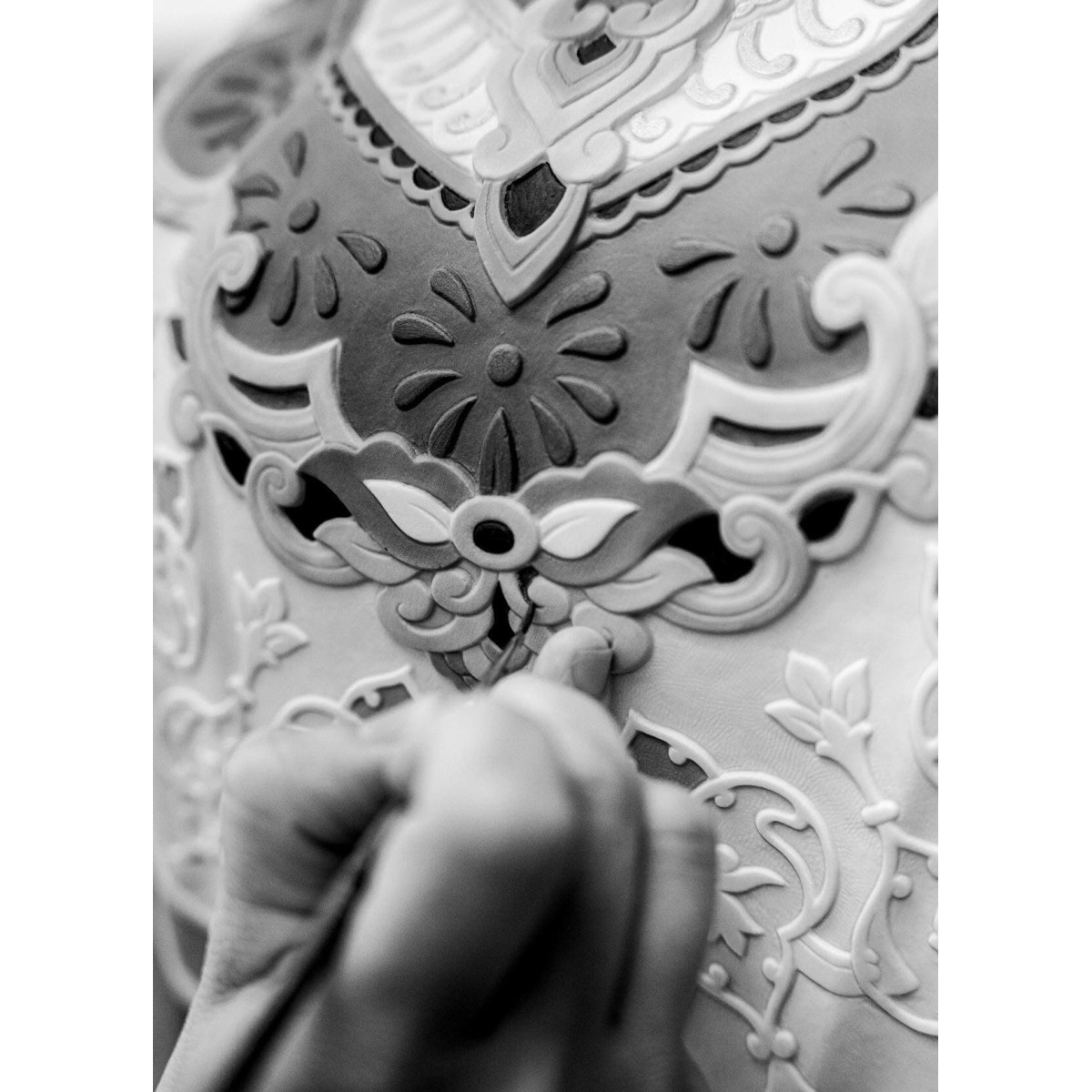 В отличие от своих африканских сородичей, восточные слоны имеют уши меньшего размера, что является отличительной чертой, указывающей на их происхождение. Этот слон стоит в спокойной и уравновешенной позе, его хобот приподнят, а ноги твердо стоят на земле, демонстрируя равновесие и присутствие духа. Его корпус укрыт детализированными накидками, вручную украшен цветочной гравировкой, подчеркивающей каждую деталь.
