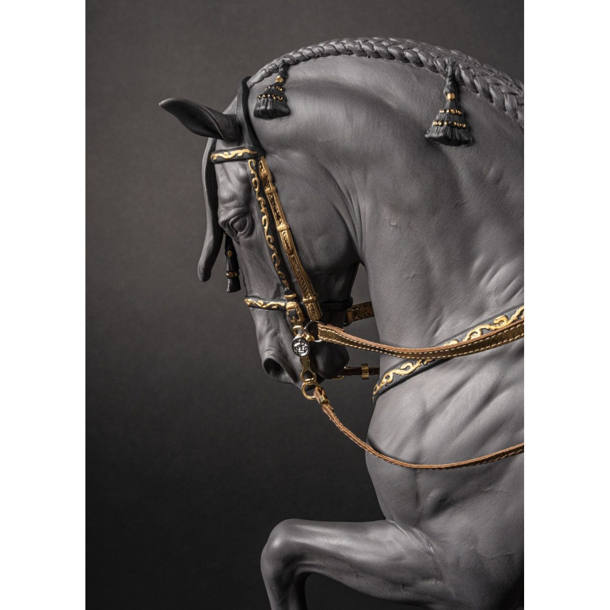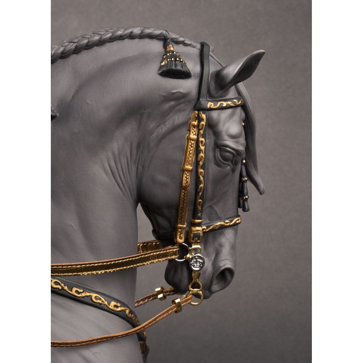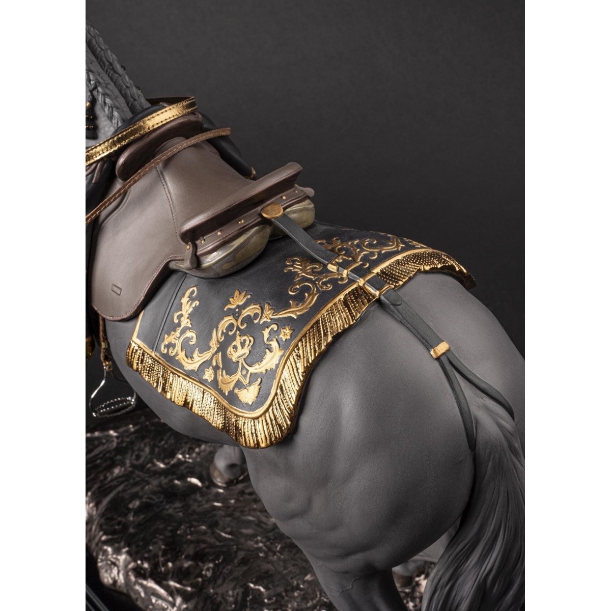 Ограниченный тираж "Испанский чистокровный конь" - это фарфоровая скульптура из коллекции "ВЫСОКИЙ ФАРФОР", выпущенная ограниченным тиражом в 500 экземплярах на мир. Это скульптура ручной работы, которая отдает дань уважения одной из самых почитаемых пород лошадей в мире. Вдохновленная величественными образцами Королевской Андалузской школы конного искусства, эта скульптура отражает красоту и природную элегантность чистокровных испанских лошадей. Скульптура выполнена с потрясающей анатомической точностью. Конь делает пиаффе, величественно приподнимая одну ногу. Скульптура выполнена из черного матового фарфора, основной тон попоны подчеркивается более глубоким черным цветом и вставками из золотого люстра.Седло, уздечка, нагрудник и попона так же богато украшены золотым люстрам . Металлические детали, такие как удила и стремена, имеют различную отделку: некоторые из них выполнены из латуни с золотым напылением, другие - из серебра, что придает изделию визуальный контраст и изысканность. Поводья и стремена изготовлены из натуральной кожи, что подчеркивает реалистичность композиции. Седло особенно примечательно своей техникой изготовления: основа из коричневой эмали, смешанной с металлическими пигментами того же оттенка, нанесена с использованием особой техники, чтобы воспроизвести текстуру и внешний вид дубленой кожи, с богатой, детализированной поверхностью.В результате получается впечатляющее произведение искусства, каждая деталь которого подчеркивает техническое и художественное совершенство высококачественного фарфора ручной работы.