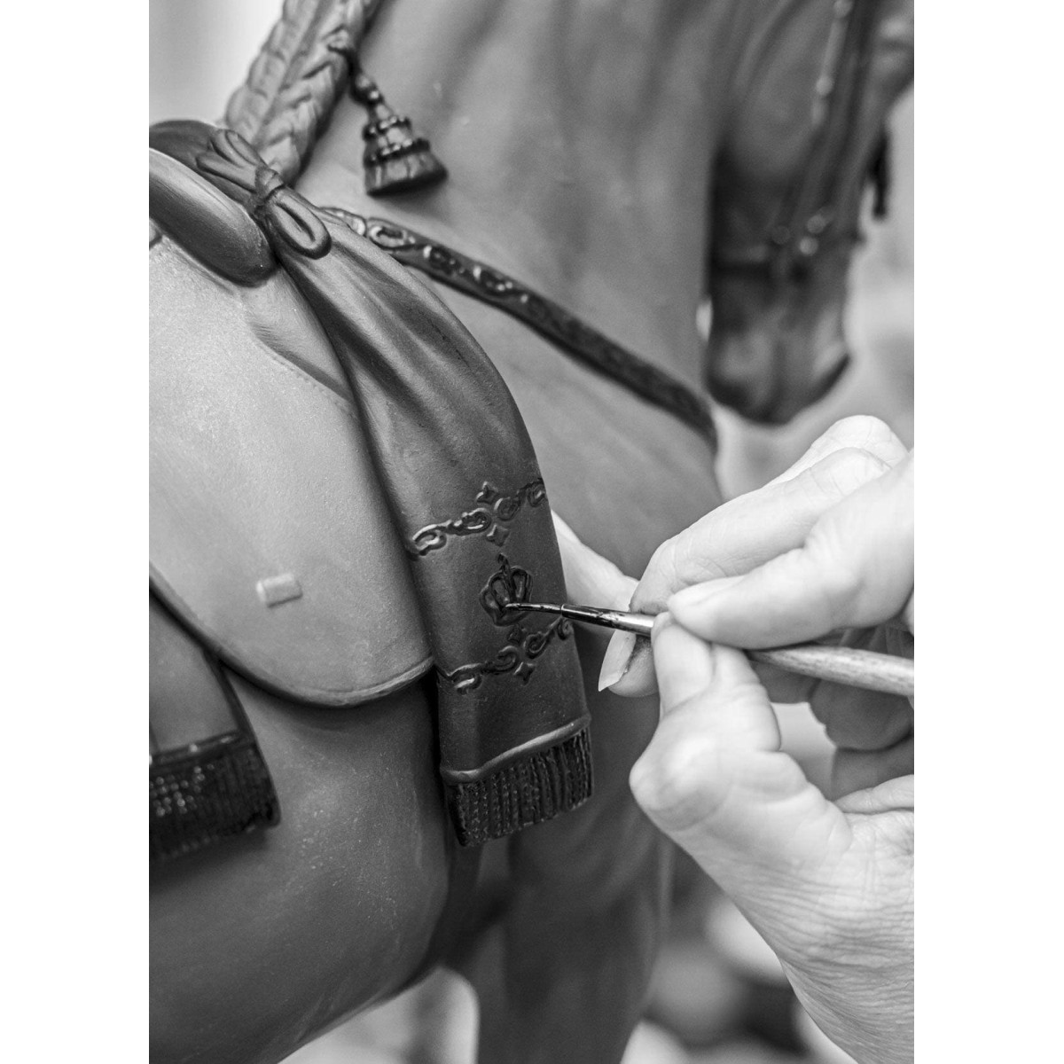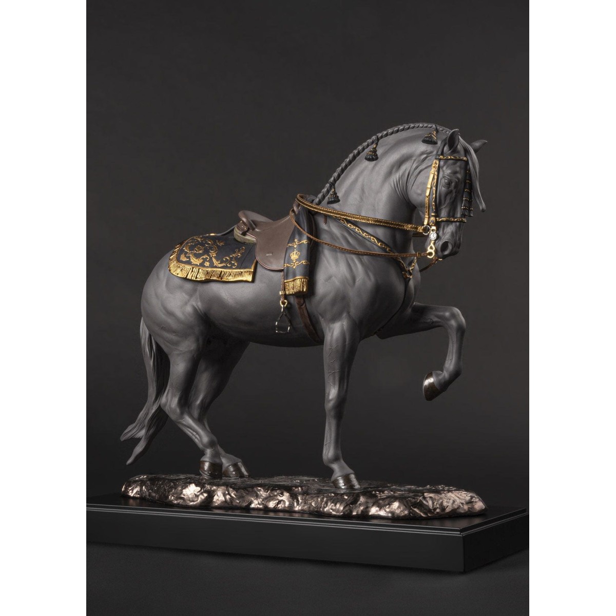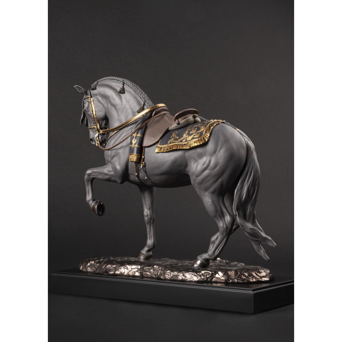 Ограниченный тираж "Испанский чистокровный конь" - это фарфоровая скульптура из коллекции "ВЫСОКИЙ ФАРФОР", выпущенная ограниченным тиражом в 500 экземплярах на мир. Это скульптура ручной работы, которая отдает дань уважения одной из самых почитаемых пород лошадей в мире. Вдохновленная величественными образцами Королевской Андалузской школы конного искусства, эта скульптура отражает красоту и природную элегантность чистокровных испанских лошадей. Скульптура выполнена с потрясающей анатомической точностью. Конь делает пиаффе, величественно приподнимая одну ногу. Скульптура выполнена из черного матового фарфора, основной тон попоны подчеркивается более глубоким черным цветом и вставками из золотого люстра.Седло, уздечка, нагрудник и попона так же богато украшены золотым люстрам . Металлические детали, такие как удила и стремена, имеют различную отделку: некоторые из них выполнены из латуни с золотым напылением, другие - из серебра, что придает изделию визуальный контраст и изысканность. Поводья и стремена изготовлены из натуральной кожи, что подчеркивает реалистичность композиции. Седло особенно примечательно своей техникой изготовления: основа из коричневой эмали, смешанной с металлическими пигментами того же оттенка, нанесена с использованием особой техники, чтобы воспроизвести текстуру и внешний вид дубленой кожи, с богатой, детализированной поверхностью.В результате получается впечатляющее произведение искусства, каждая деталь которого подчеркивает техническое и художественное совершенство высококачественного фарфора ручной работы.