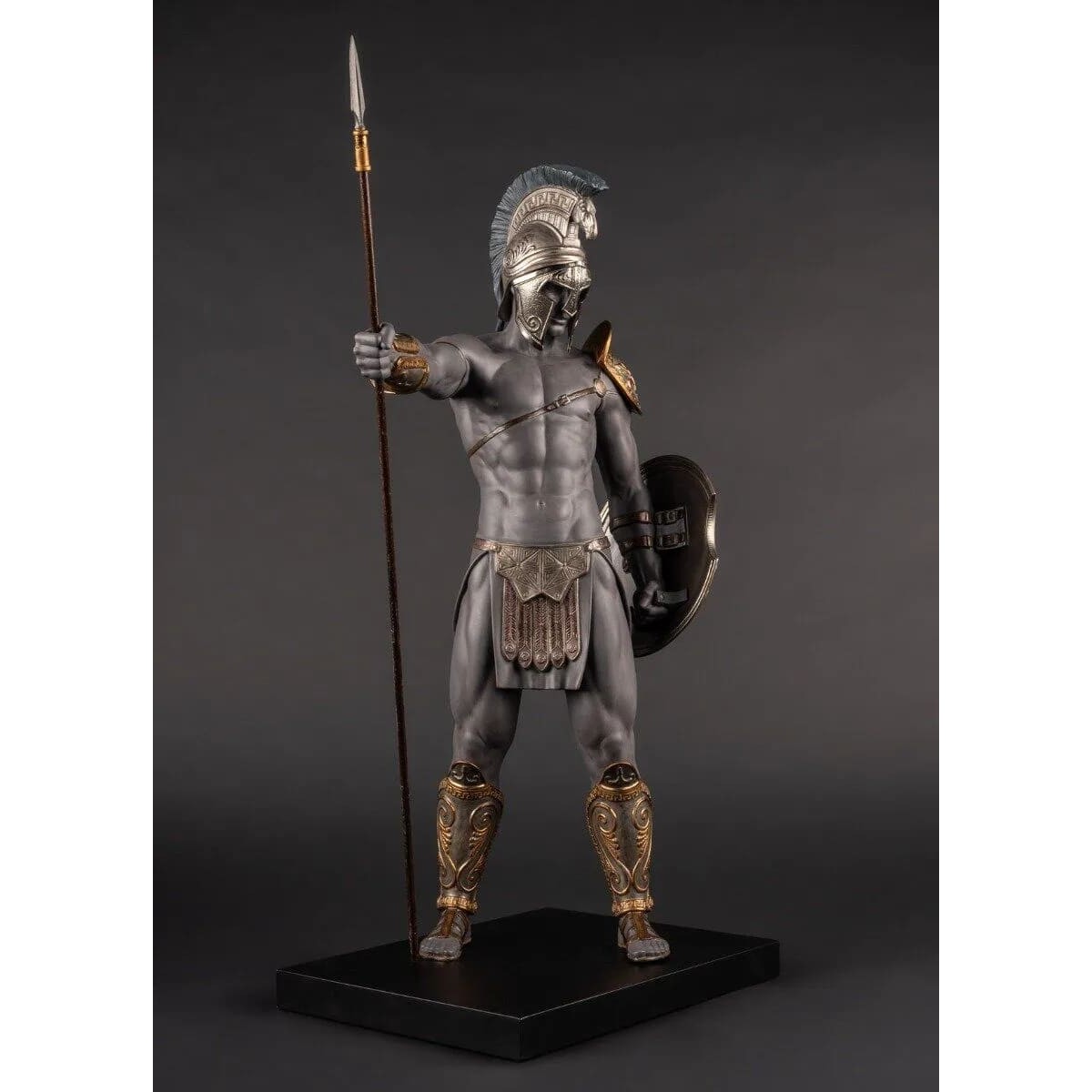 Мужество и самопожертвование этих греческих воинов навсегда вошли в историю. Эта скульптура из черного матового фарфора изображает одного из отважных спартанцев в шлеме с плюмажем и в маске, которая крепится на магнитный механизм и ее можно снимать, открывая лицо воина. Обилие деталей в отделке, точно воспроизведенная анатомия и тщательный орнамент демонстрируют исключительную степень виртуозности наших мастеров. Изготовлен из черного фарфора и украшен металлическим люстром, синей и черной эмалью. Щит окрашен в черную глянцевую эмаль с эффектом мрамора, а шлем украшен серебряным люстром. В результате получается эффектная и мощная фигура, которая одновременно благородна и элегантна.
