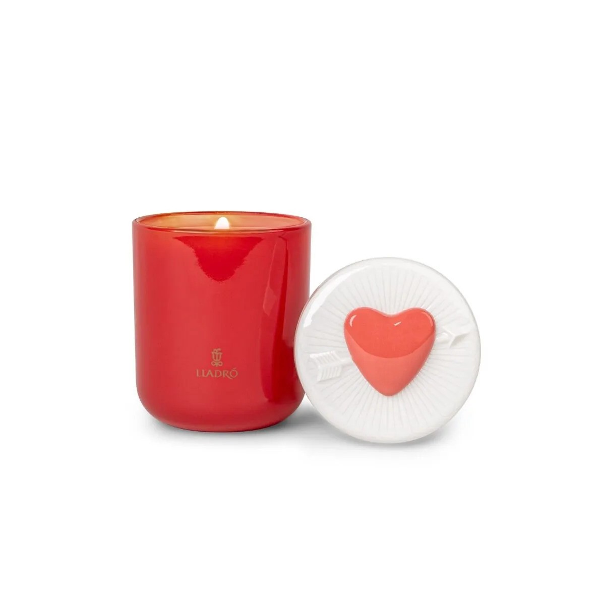 Свеча с цветочным ароматом с нотами ванили, меда и ягод. Подсвечник выполнен из стекла с фарфоровой крышкой на которой вручную выгравировано сердце темно-красного цвета, пронзенное стрелой.