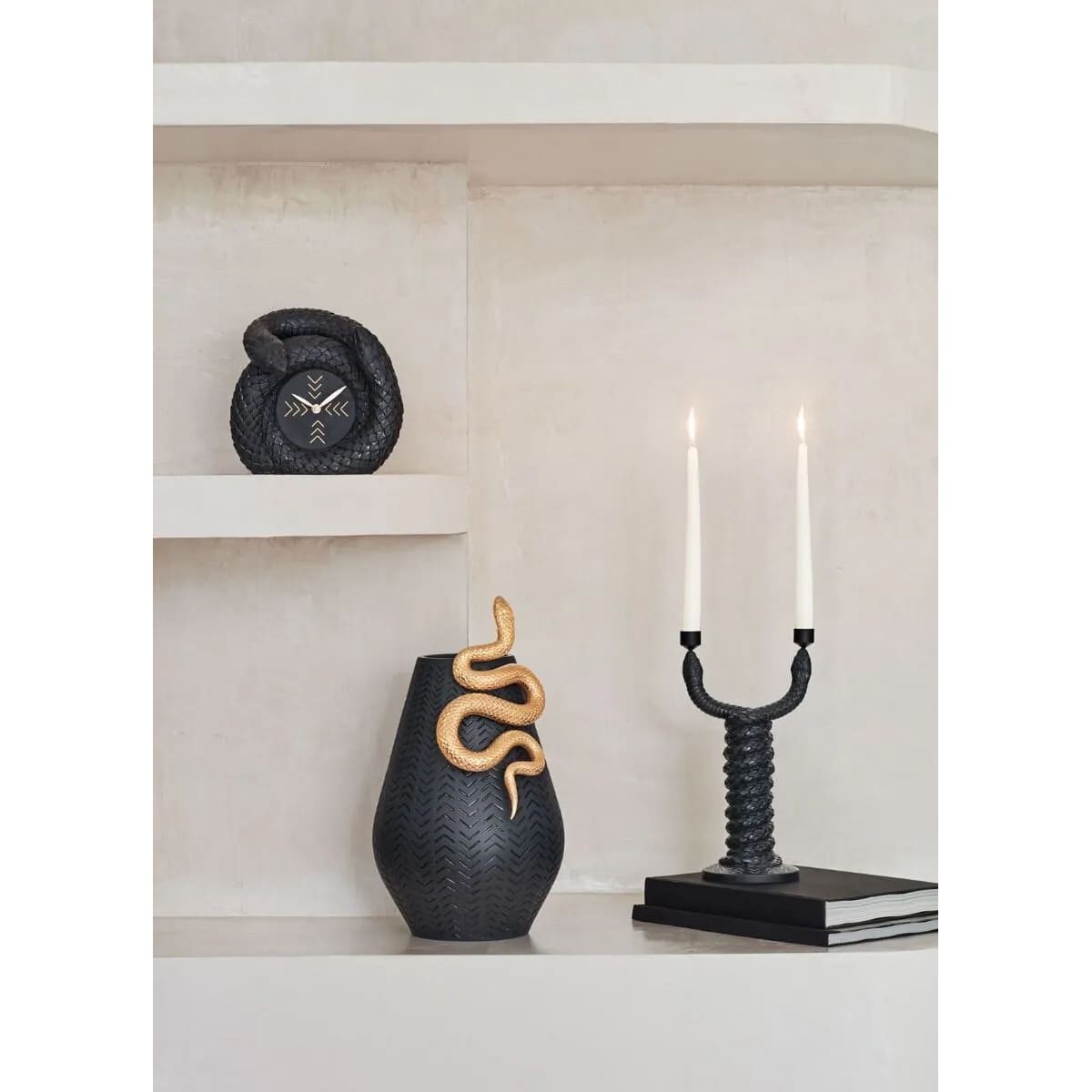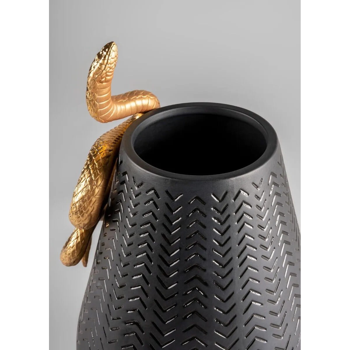 Черная фарфоровая ваза, украшенная золотой змеей. Матовая черная фарфоровая ваза из коллекции SNAKES . Змея - очаровательное существо, которое пробуждает в людях воображение и любопытство, несмотря на страх. Согласно различным культурам, это древний символ жизненного цикла, мудрости и знаний, духовности и силы . Дизайн этого изделия основан на контрасте между чистыми линиями вазы, выполненной в строгом черном цвете, и извилистым движением змеи, украшенной золотым люстрам